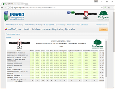 Gestión de mantenimiento de parques y jardines en la ciudad de Irún, para perfiles de acceso del ayuntamiento y la contrata. Genera informes de incidencias, avisos y partes, por descripción, por barrio