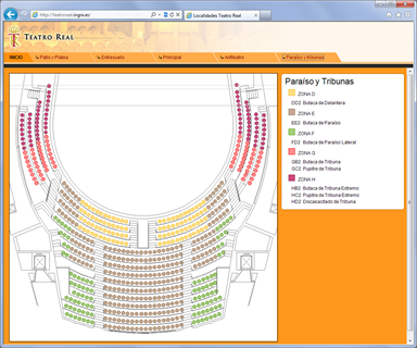 La información de planos 2D procede también de Ingrid y en la web sirve para la selección de la localidad a adquirir. En cada localidad se muestra una vista interactiva de un modelo 3D del Teatro, para verificar la visibilidad real del escenario desde esa localidad. ... |