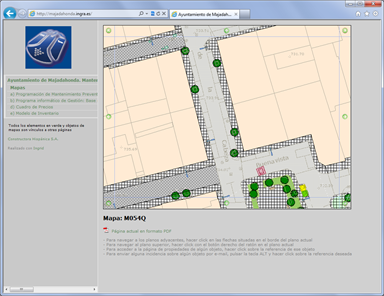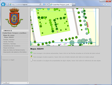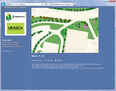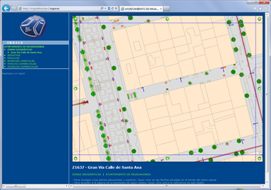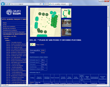 Incluye una BD paralela de cartografía vectorial escala 1:1.000 y unos 10.000 elementos de inventario entre arbolado y jardinería de diversas clases y mobiliario urbano. En este proyecto se han trabajado todas las zonas administrativas y de distribución de mantenimiento, ya que no existían en formato digital. La web muestra fichas de todas las zonas de mantenimiento y parques, páginas de familias de jardinería y mobiliario, estadísticas, mapas temáticos y un plan de mantenimiento. |