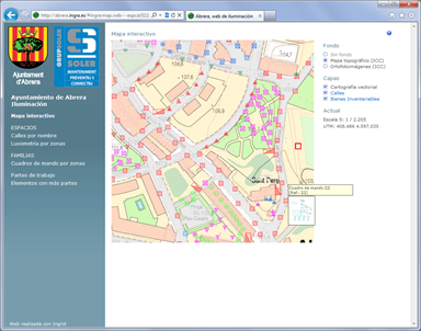 Web prototipo de proyecto de redes de iluminación, con información completa tanto de inventario como de mantenimiento (partes de trabajo por periodos, con todo detalle, clasificación de elementos con más actuaciones, etc. Utiliza un mapa con capa de ortofotos y topografía de fuentes WMS estándar