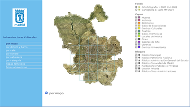 Publicación web de información de Infraestructuras culturales (museos, archivos, bibliotecas, teatros...) en cinco distritos del ayuntamiento de Madrid, con catalogación por categoría, naturaleza, mapas temáticos, fichas urbanísticas...