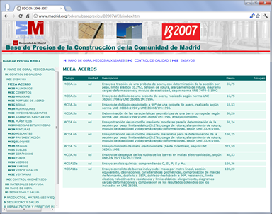 Web paramétrica con la base de precios completa de la Comunidad de Madrid. Incluye búsqueda en lenguaje natural basada en un tesauro de la construcción generado por Ingrid para su funcionamiento en el cliente, sin servidor de aplicaciones. Versión actual pública hasta 2013