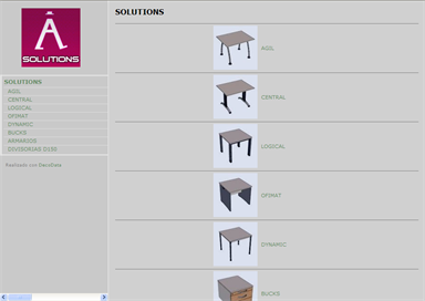 Catálogo paramétrico de mesas del distribuidor de mobiliario Solution, con derivados y combinaciones incompatibles calculadas en la web en tiempo real en el navegador del cliente (sin servidor de BD)