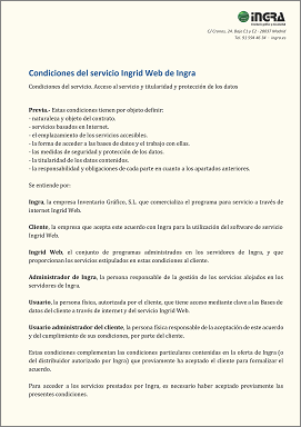 Clausulas de uso que el usuario administrador designado por el cliente tiene que aceptar cuando se contrata el alojamiento administrado de Ingrid en servidores de Ingra. La aceptación de las condiciones se realiza la primera ver que se accede a la aplciación.