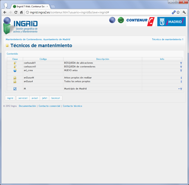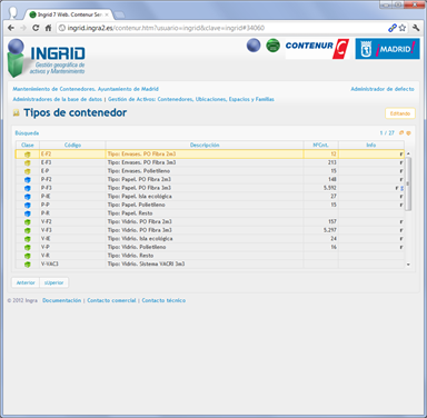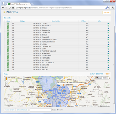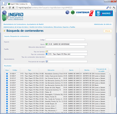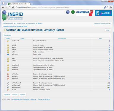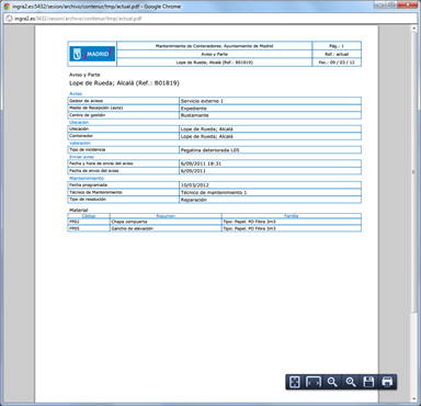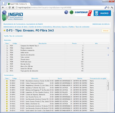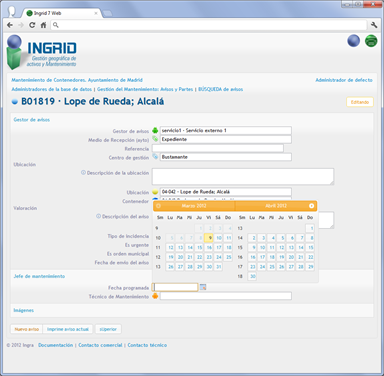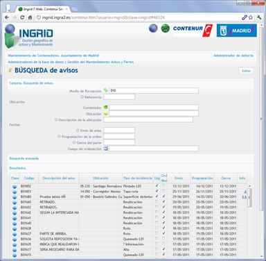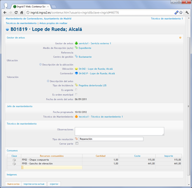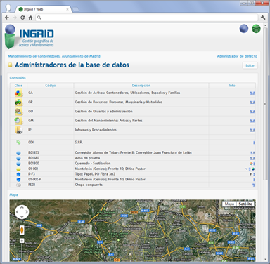 Detalles del funcionamiento del proyecto para el servicio de mantenimiento de contenedores de recogida selectiva para el Ayuntamiento de Madrid, gestionado desde cualquier navegador web: generación de avisos, creación de órdenes, e introducción de partes, incluso la edición geográfica de ubicaciones y vistas de situación en Google Street view
