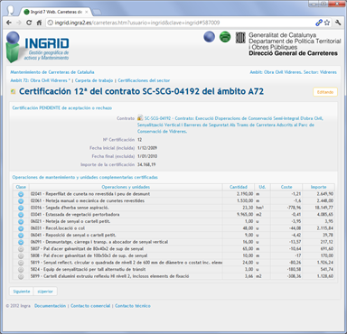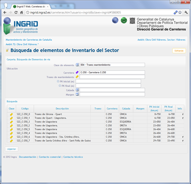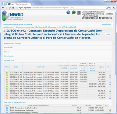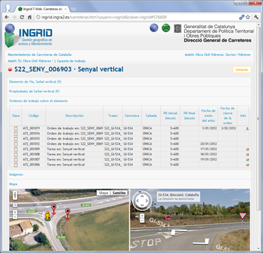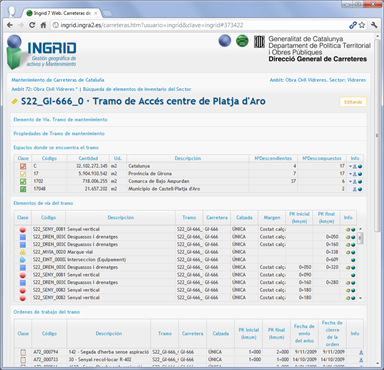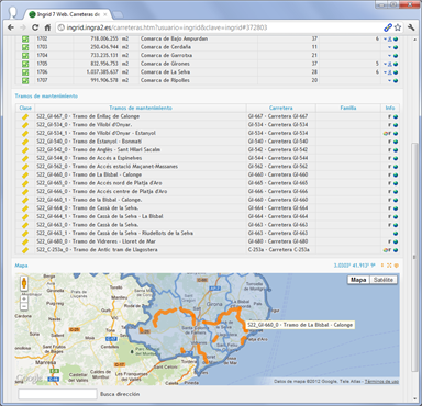 Gestión de inventario y mantenimiento de carreteras distribuido en decenas de ámbitos de mantenimiento. Aplicado a la Dirección de Carreteras de Cataluña, se abarca el inventario, órdenes y partes de trabajo, además de certificaciones de varios sectores de la Comunidad