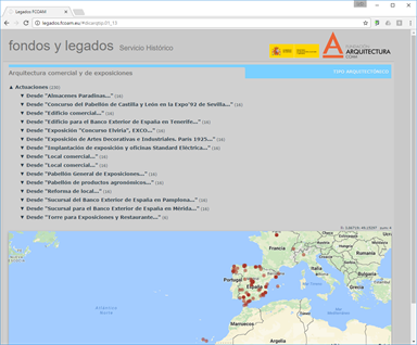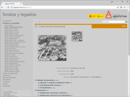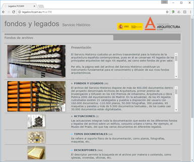 La web generada por Ingrid v8, organiza los fondos publicados hasta la fecha (se prevé añadir cada 6 meses una cantidad similar) de los 45 legados custodiados actualmente en el COAM, Las unidades documentales, con sus imágenes se organizan por actuaciones, tipos documentales, descriptores, cronología, autores y localización geográfica. Las actuaciones se irán completando hasta tener un mapa mundial de fondos y legados.